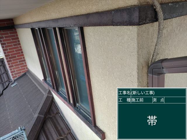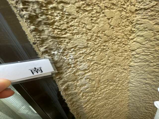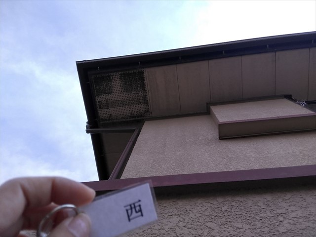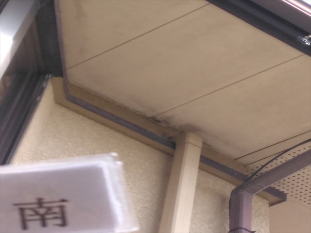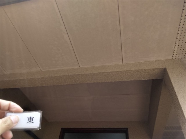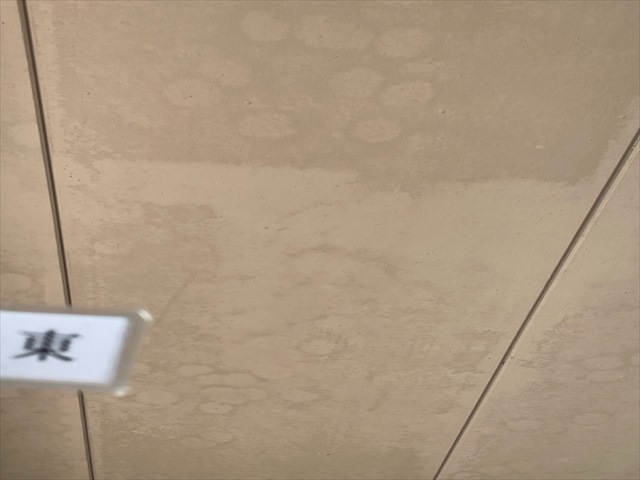 石岡市でおこなった現地調査、軒天は劣化して表面の色が変わっているのが分かります。