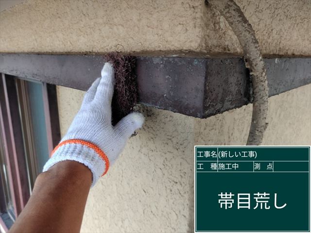 モルタル外壁の板金化粧柱をケレン作業で研磨していきます。