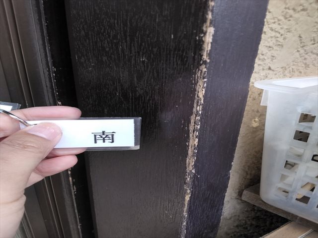 劣化部分に汚れがついた木部部材と、表面が劣化してチョーキング現象がおこっていた雨戸です。