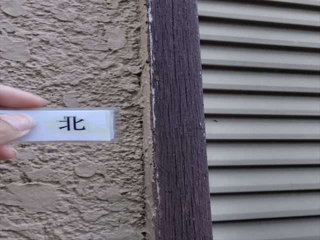 石岡市現地の化粧柱は、塗膜が劣化して、苔や剥がれがみられました。