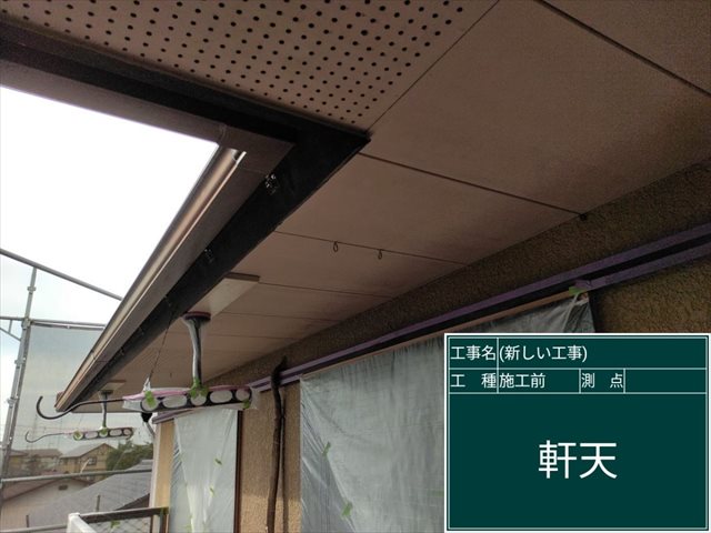 軒天材自体に穴が空いていたり、大きな腐食はみられないので、洗浄と塗装で大丈夫でしょう。