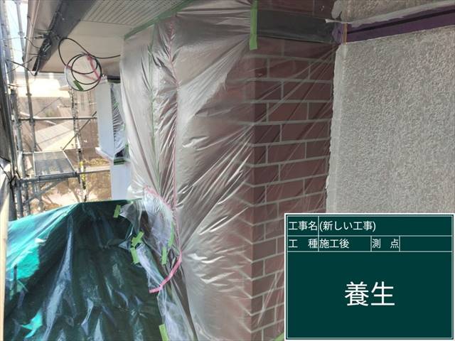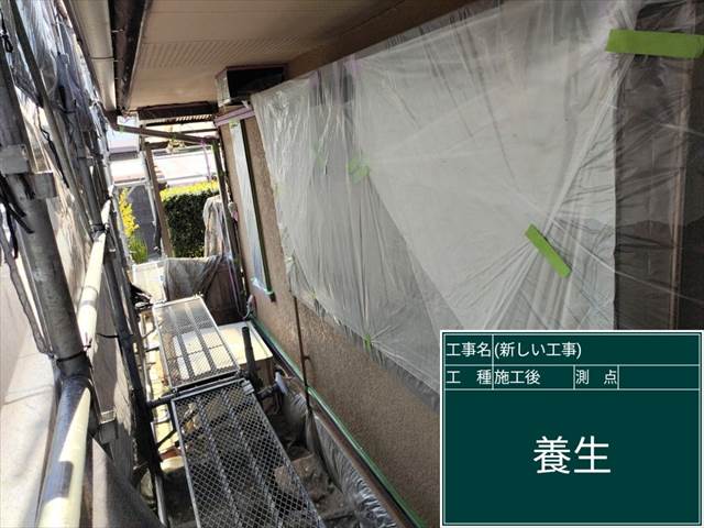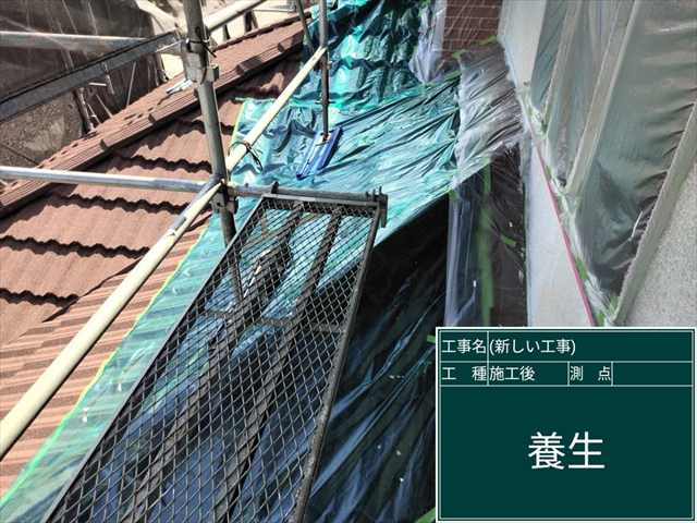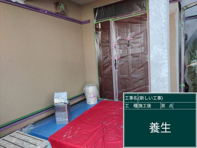 あとから塗装をおこなう下屋根、玄関ドアに、外壁の塗料がつかないようにカバーをしていきます。