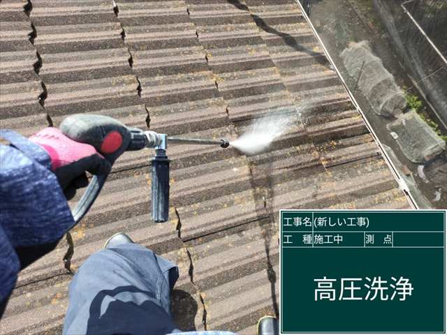足場を建ててはじめにおこなうのは、高圧洗浄です。
