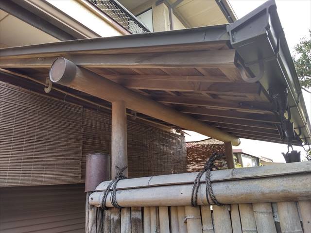 同じ角度での写真でなくて恐縮ですが、凸凹して黒カビがあった軒天も、あちらこちらにある化粧柱も、傷んでいる箇所は全てチェックをして、補修と塗装をおこなっています!