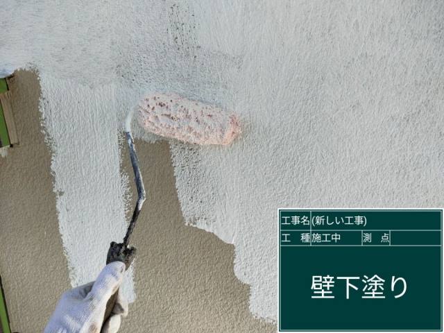 石岡市の外壁塗装現場、まずは下塗りをおこないます。