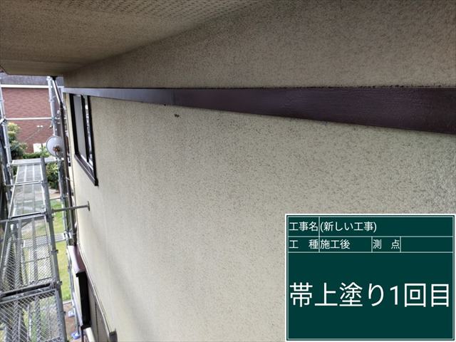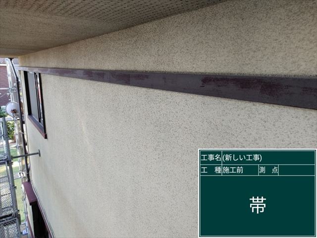 かすみがうら市の築35年の外壁塗装現場、今回は帯板を先に塗装していきます。
