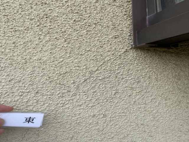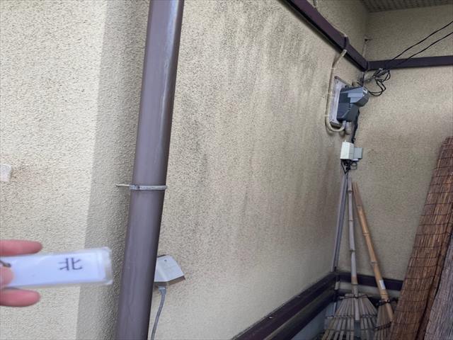 前回の塗装からはおよそ10年弱、モルタル外壁はひとめでわかるくらい塗膜が劣化して汚れています。