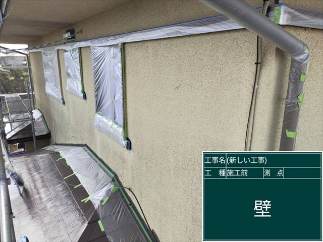 外壁を塗装するために、塗装しない部分を養生していきます。