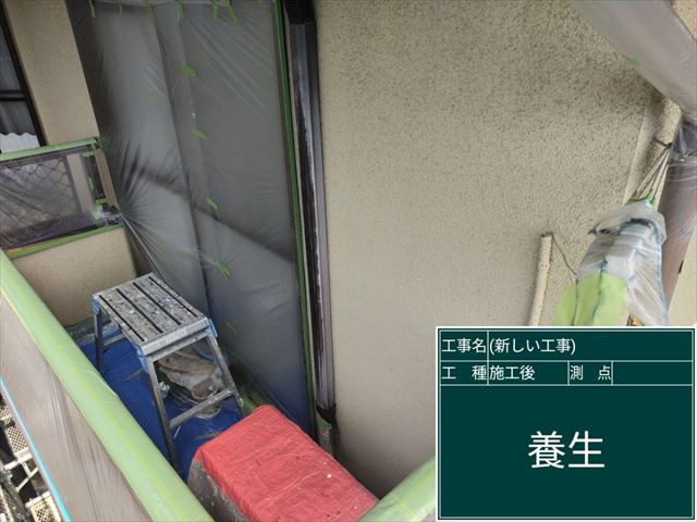 雨樋の部分とベランダやエアコンの室外機なども養生していきます。