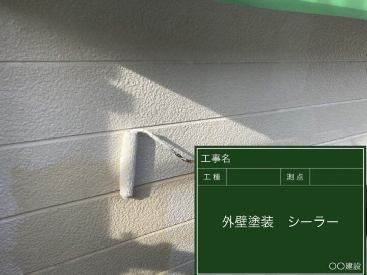 下地と上塗り塗料との接着剤の役割を果たす、エポパワーシーラーを塗布していきます。幅広い下地に対応できる水性の外壁用下塗り剤です。