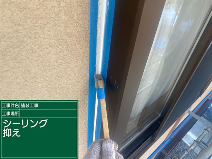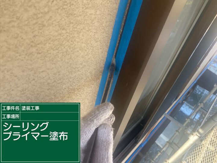 シーリングの打ち増しをおこなうサッシ周りを青いテープを使い養生をおこない、下塗り剤のプライマーを塗布していきます。