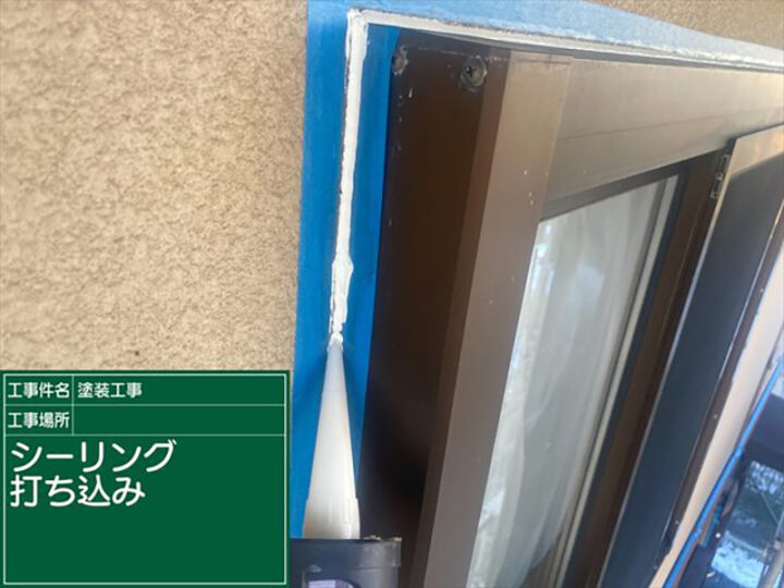 シーリングの打ち込みます。シーリングを均す押さえの作業をおこないます。