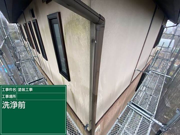 足場を設置し、高圧洗浄をおこないます