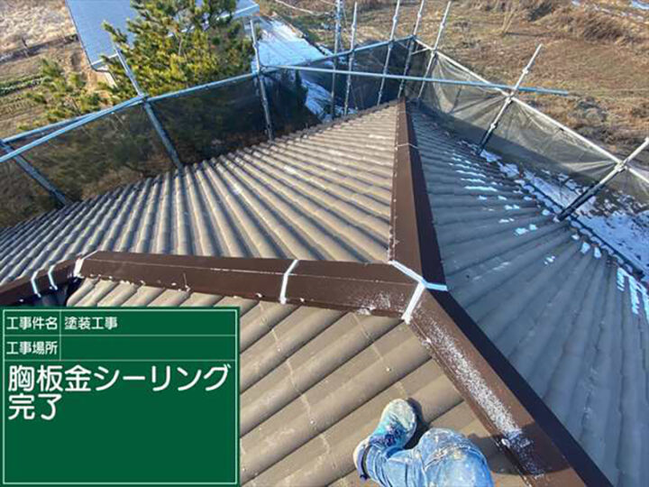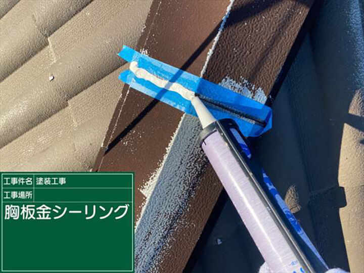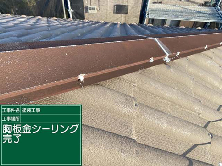 棟板金にシーリングの打ち込む作業が完了しました。