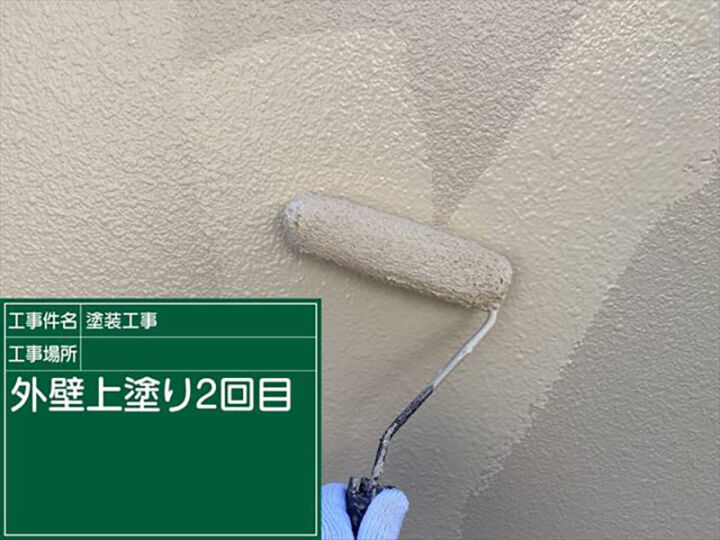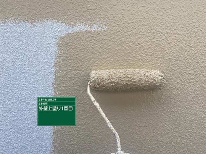 中塗り(上塗り1回目)のようすです。下塗りと同じようにダメ込みをおこなってから、ローラーを使用します。こちらは親水性が高く、紫外線劣化にも強い塗料を使用しています。