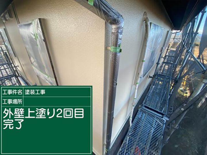 上塗り(2回目)の作業のようすと、上塗りが完了した外壁のようすです。