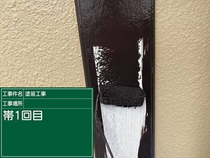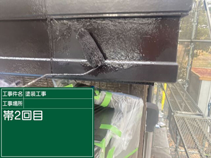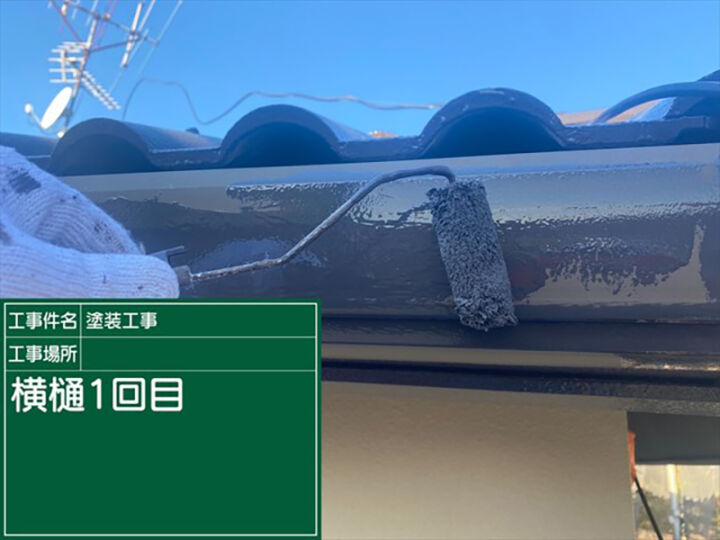 付帯部の一部である横樋の作業のようすです。下地調整のケレン作業をおこない、1回目の塗装をおこなっているようすです。2回の塗り重ねで施工は完了です。