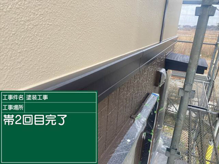 帯板や幕板と呼ばれる、部材の施工のようすです。1階と2階の境目のカバー材として取り付けられていたり、美観のために取り付けられている部材です。