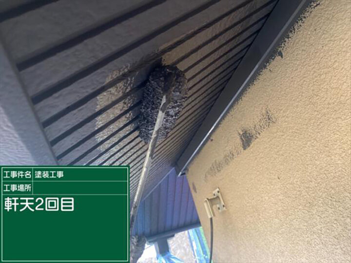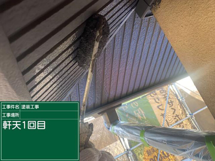 軒天(のきてん)の塗装のようすです。軒天は湿気が溜まりやすい部分なので、防カビや防藻の機能をもった塗料で施工しています。