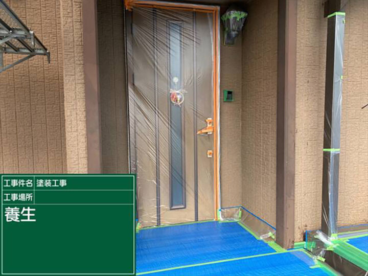 玄関のドアや床、サッシなどをビニールを使用し、汚れやキズから守ります。玄関ドアは、開閉ができるように養生がしてあります。
