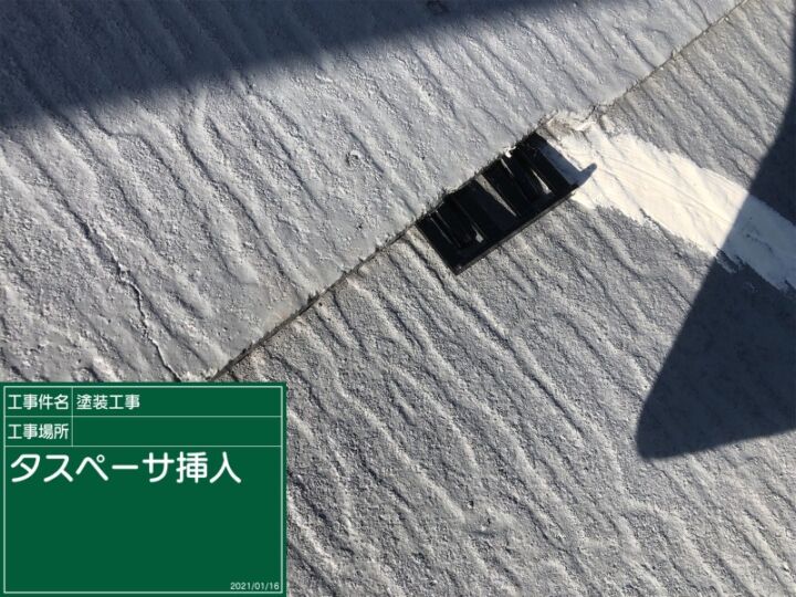 コロニアル屋根は、屋根材の隙間が少なく、塗料で埋まってしまう危険があるため、タスペーサーを設置し、縁切りしていきます。