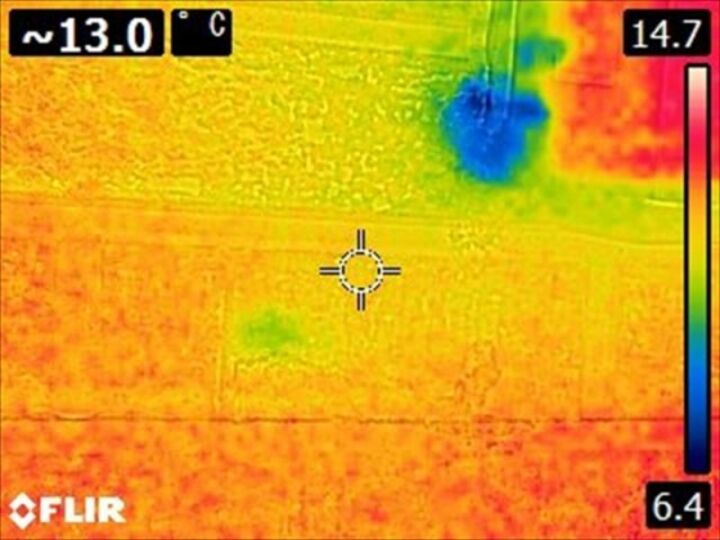 サーモカメラを見るとわかりますが、ヒビがあるところが青くなっています。これは、外壁内部に雨水が溜まって結露を起こしているせいです。