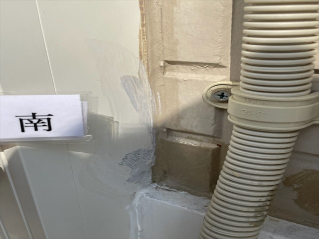 入隅部分のシーリング塗膜ヒビ割れと、出隅部分のお客様が塗られた箇所です。