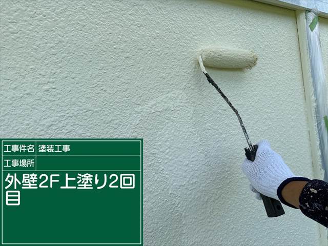 かすみがうら市外壁塗装現場、上塗り1回目の乾燥を待ってから2回目の塗装をおこないます。