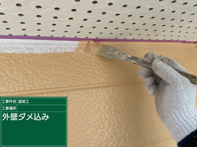 かすみがうら市の外壁塗装現場、ダメ込みと呼ばれる作業です。