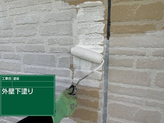 かすみがうら市の外壁塗装、エポパワーシーラーによる下塗りが完了しました。