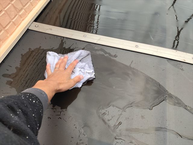 屋根から順に洗い流していき、水も時間も効率的に使って作業していきます。