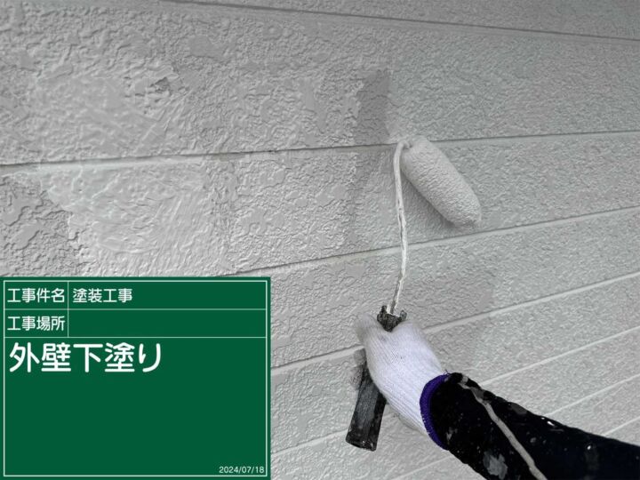 まずは下塗り材で外壁表面の小さい傷やひび割れを埋めていきます‼️
