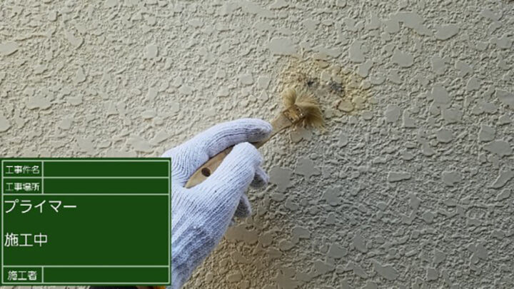 外壁にシリコンで補修したあとがあったので、今後の塗装のためにプライマーを塗布しました。