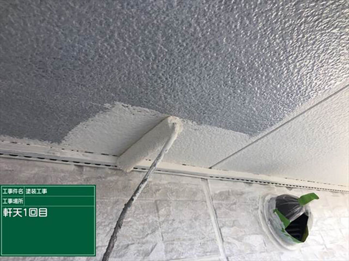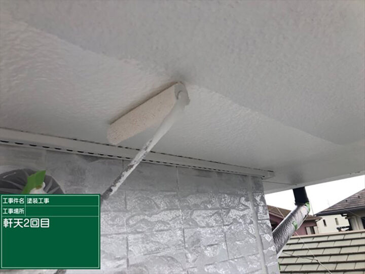 軒天(のきてん)は、湿気が溜まりやすいので、防カビ・防藻の効果があるマルチエースⅡを使用します。塗装の基本、2回の重ね塗りをおこなます。