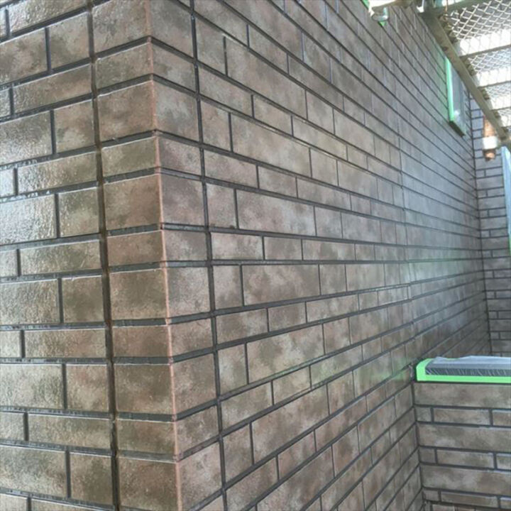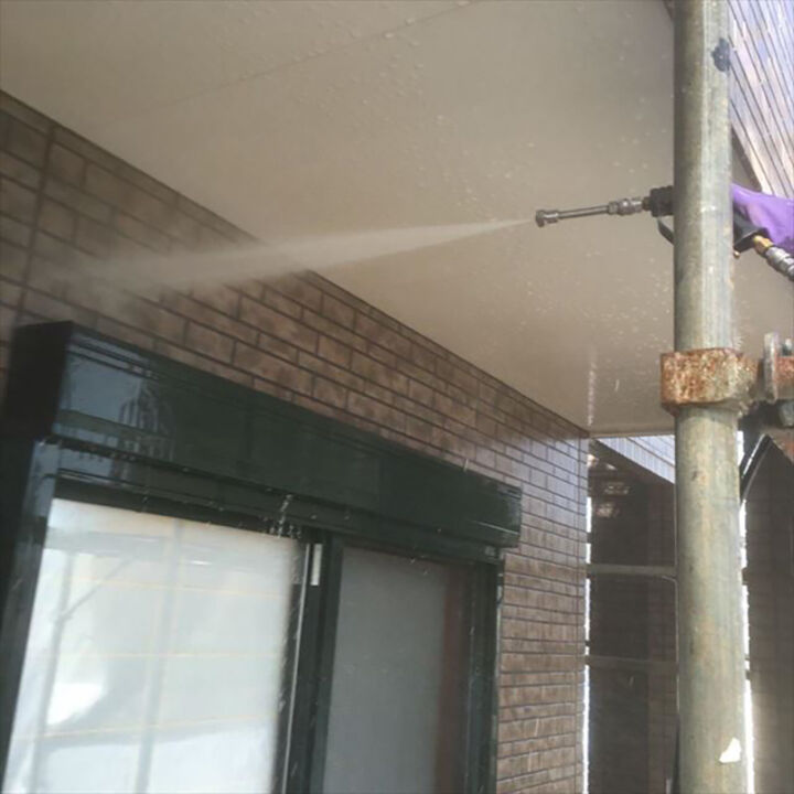 高圧洗浄機で外壁に付いたゴミやコケなどを洗い流していきます。今回外壁がクリア仕上げなので、外壁を傷つけないように優しく洗いました。