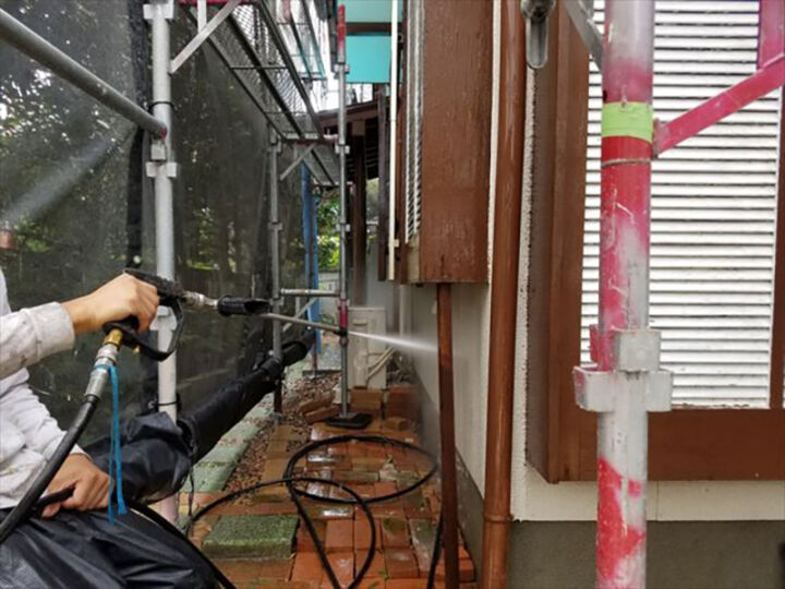 石岡市のモルタル外壁の家、調査や仕様が決まりいよいよ施工開始です。 足場を立てたら塗装施工前に高圧洗浄をおこないます。 長年溜まったホコリやゴミ・コケ等を洗い流す作業です。 !ポイント! ホコリやゴミがありますと塗料の食いつきが悪く、剥がれや膨れ等の原因に繋がります。そのため、どの現場も施工する作業になります。