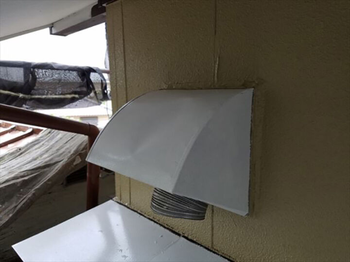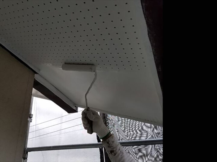 石岡市のモルタル外壁塗装現場、軒天塗装の様子です。 今回の石岡市のお客様邸の近くには霞ヶ浦などの川や湖はありませんでしたが、軒天は構造上湿気が溜まりやすい場所です。 !ポイント! 湿気が溜まりやすい軒天には、軒天用の防カビ塗料をオススメいたしております。 湿気が溜まり軒天が剥がれ落ちるなど原因になりますので、専用の塗料使うことをお勧めします。役物(やくもの)の施工!