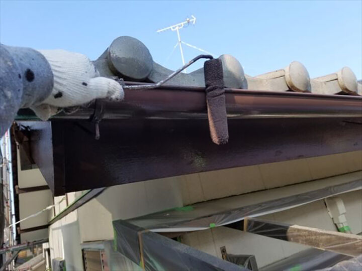 雨樋塗装をおこないます。 役物(やくもの)とは、隅瓦や雨樋など、特定の場所にのみ使用するために通常とは異なる形に作られた建材を指します。 !ポイント! 雨樋は塗装したから耐久性が上がる事はありません。 外壁等を塗装した際、あくまでも美観の為に塗装をオススメしております。 耐久性をどうしてもあげたいとのご希望の場合は交換をご提案いたします。