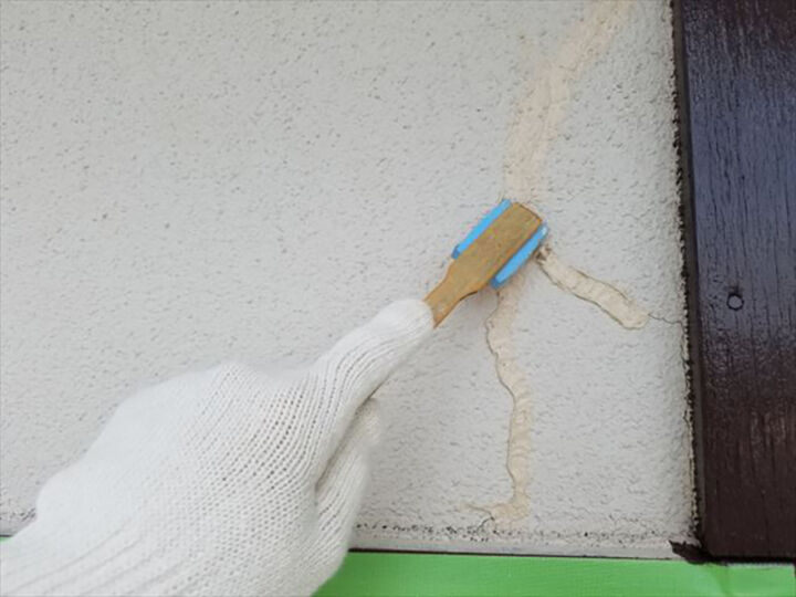 石岡市の外壁塗装現場、モルタル外壁にできたクラック(ひび割れ)補修の作業の様子です。 外壁のクラックは幅0.3mm以上になりますと構造クラックと呼ばれ補修が必要になります。 !ポイント! わずかな隙間でも水は毛細管現象により内部に侵入し、雨漏りや断熱材・柱等を腐食させてしまいます。施工前や施工中など説明がない場合は、補修を必ずおこなっているかどうか確認していきましょう。 ※毛細管現象とは、わずかな隙間により吸い上げる力が強まり、内部に水が侵入する現象のことです。