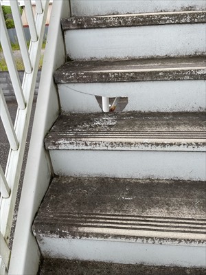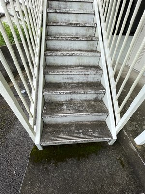 吹きさらしの状態なので、踏み面が苔やカビなどの汚れが付着し、黒ずんでしまっています。よく見ると、蹴込板がひび割れ穴が開いてしまっています。穴は補修し、汚れは高圧洗浄で洗い流します。