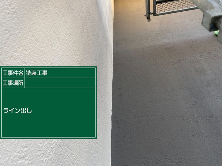 モルタル外壁塗装現場、白とグレーの境い目の部分です。