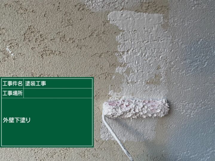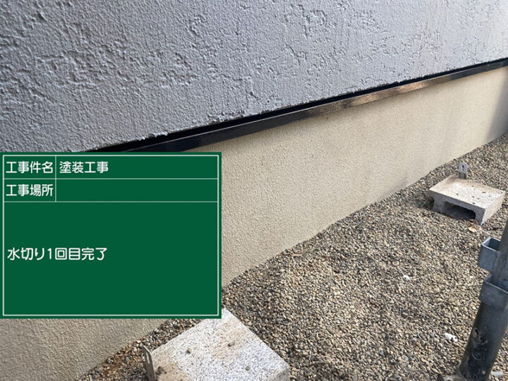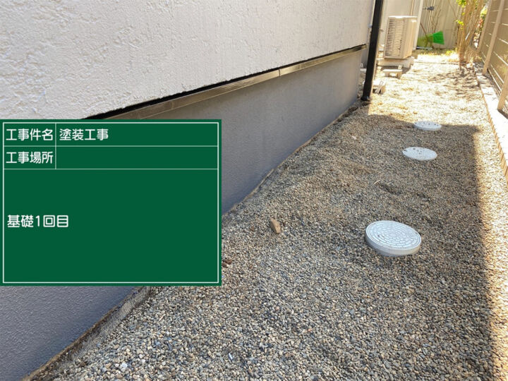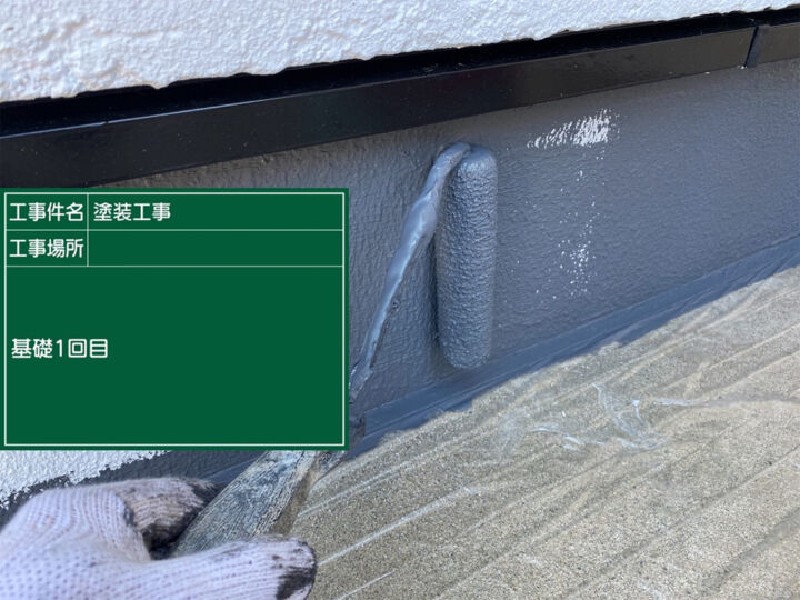 1回目の塗装の様子です。ベースプロテクトを使用しました。耐久性、防カビ・防藻効果が高く、コンクリートの劣化症状である中性化を抑制します。