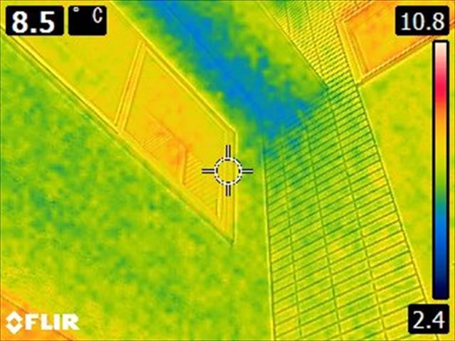 サーモグラフィーで雨漏り箇所が無いか確認します。軒天部分の温度が低く表示されました。水分が多く含まれていることがわかります。