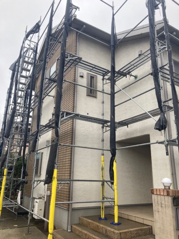 足場は、安全に効率よく作業する為に欠かせないものです。弊社では専門の業者に依頼し、足場を設置しております。洗浄時の水や塗料が飛散しないように、足場にネットをかけ作業します。風の影響を受けやすいので、強風時にはたたみます。