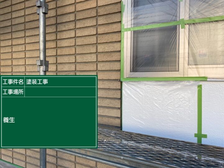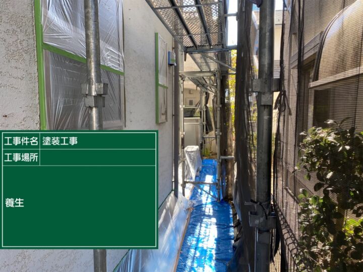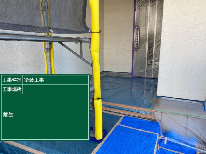 養生の様子です。塗装しない箇所や汚してはいけない箇所を保護する為、ビニールやテープ等その箇所に適したものを使い分けて養生していきます。