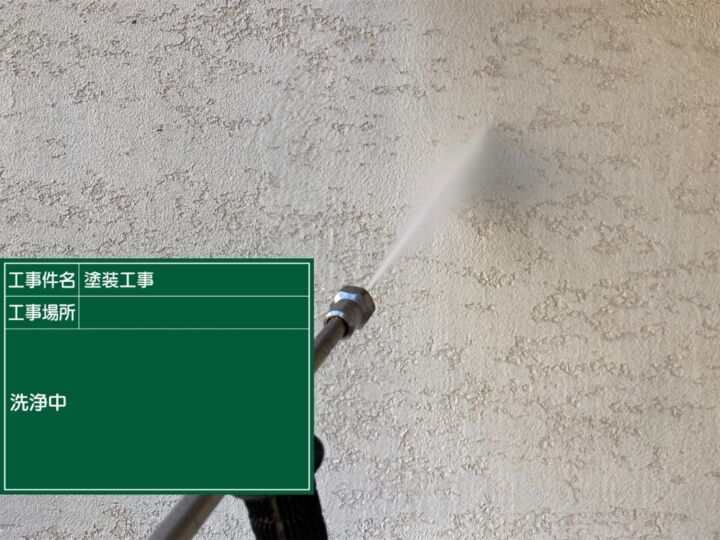 高圧洗浄の様子です。塗装前には必ず洗浄を行います。長年蓄積された汚れや古い塗膜までをしっかりと洗い流し、下地を整えます。塗装箇所だけでなく、サッシなど家をまるごと洗浄しますので、作業は一日がかりで行います。