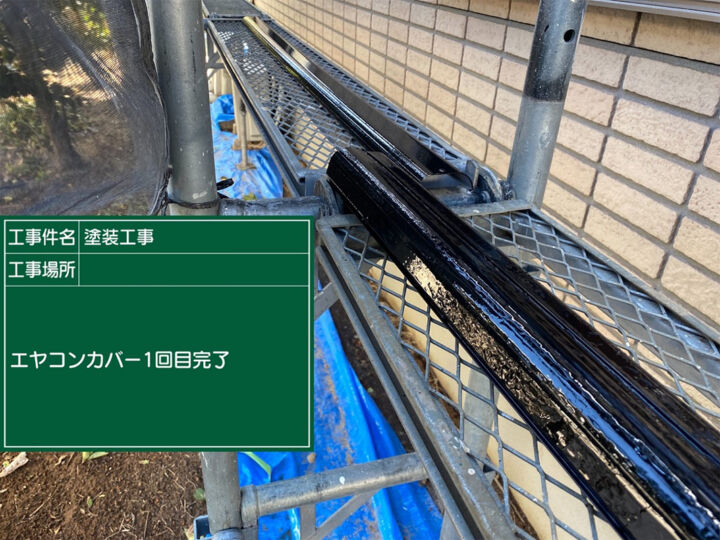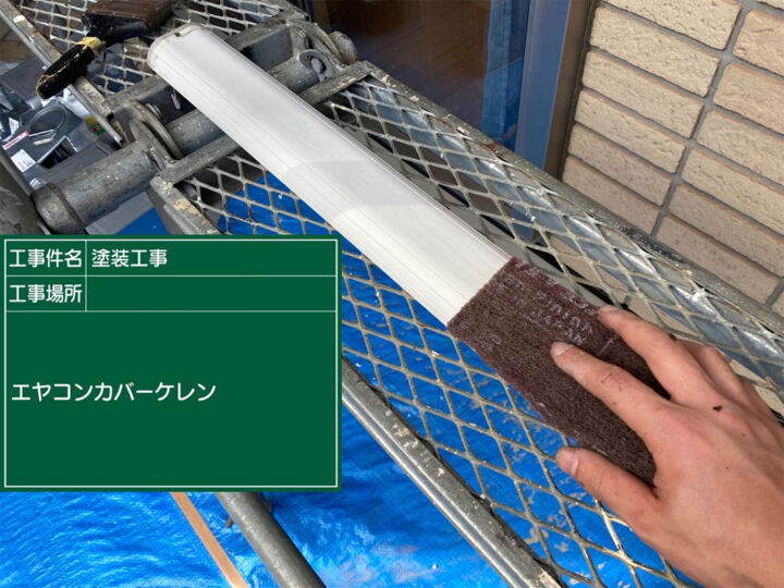 エアコンカバーは外してから塗装していきます。まずは、ケレン作業で下地を整えます。他の付帯部同様、高機能塗料のフッ素UVコートを使用して1回目の上塗りを行いました。