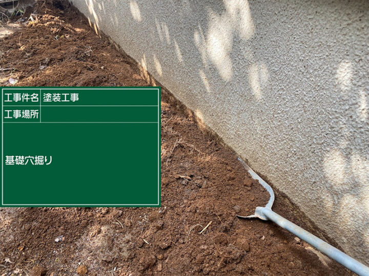 周囲の土に塗料が垂れないように土に養生をし、下塗りを行います。