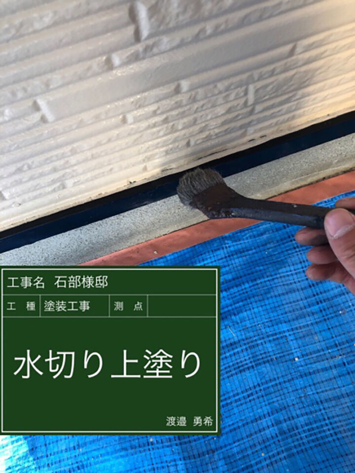 外壁と基礎土台の間の細長い部材である『土台水切』を塗装していきます。
