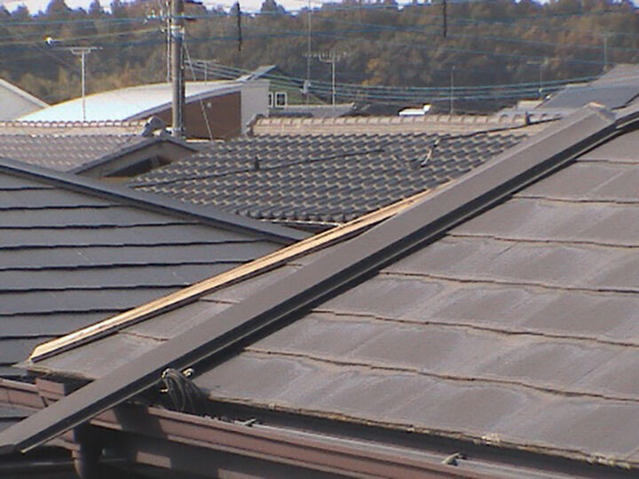 棟板が外れ、貫板が見えていってしまっています。棟板は屋根のてっぺんで屋根瓦を抑えて飛んでいったりずれるのを防ぐ役割があります。